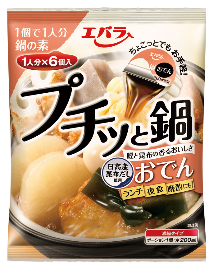 1人でも手軽に鍋が楽しめると人気の1個で1人分の鍋の素「プチッと鍋」シリーズに「プチッと鍋 おでん」が新発売。同商品は、カツオと昆布の豊かなうまみを生かした、やさしく上品な味わいが特長。同品1個と水200mlを合わせ、好みの具材を入れて煮込むだけで簡単におでんがで出来上がる。1人前から作りたい量に合わせて作る事ができるので、無駄なくおでんが楽しめるほか、夕食時だけでなく、ランチや夜食、晩酌などさまざまなシーンに対応。1人から大人数まで、おでんの楽しみが広がる。また、既存の「鶏白湯鍋」も品質・パッケージを一新し「同 濃厚白湯鍋」として新たに発売。鶏油(チーユ)をさらにきかせる、口当たりまろやかな味わいに仕上げた。。