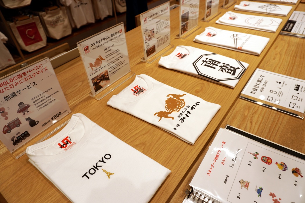 「UT」のスペースもかなり充実。「UTアーカイブスペース」では、2002年からのユニクロのTシャツの変遷や過去に人気を博したコンテンツなどを展示。もちろん新作をはじめとする注目のアーティストとのコラボUTも充実のラインアップ。その場で、タブレットを使ってオリジナルデザインのTシャツやトートバッグを作ることができる「UTme!」では、UNIQLO TOKYOの限定企画として、銀座の地元人気10店舗とのコラボデザインが登場。「銀座 松﨑煎餅」や「銀座 みかわや」など老舗や人気店のデザインを生かした個性的なアイテムを作ることができる。