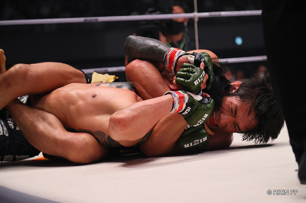 3R、石司のテイクダウンに成功しスリーパーホールドを狙う