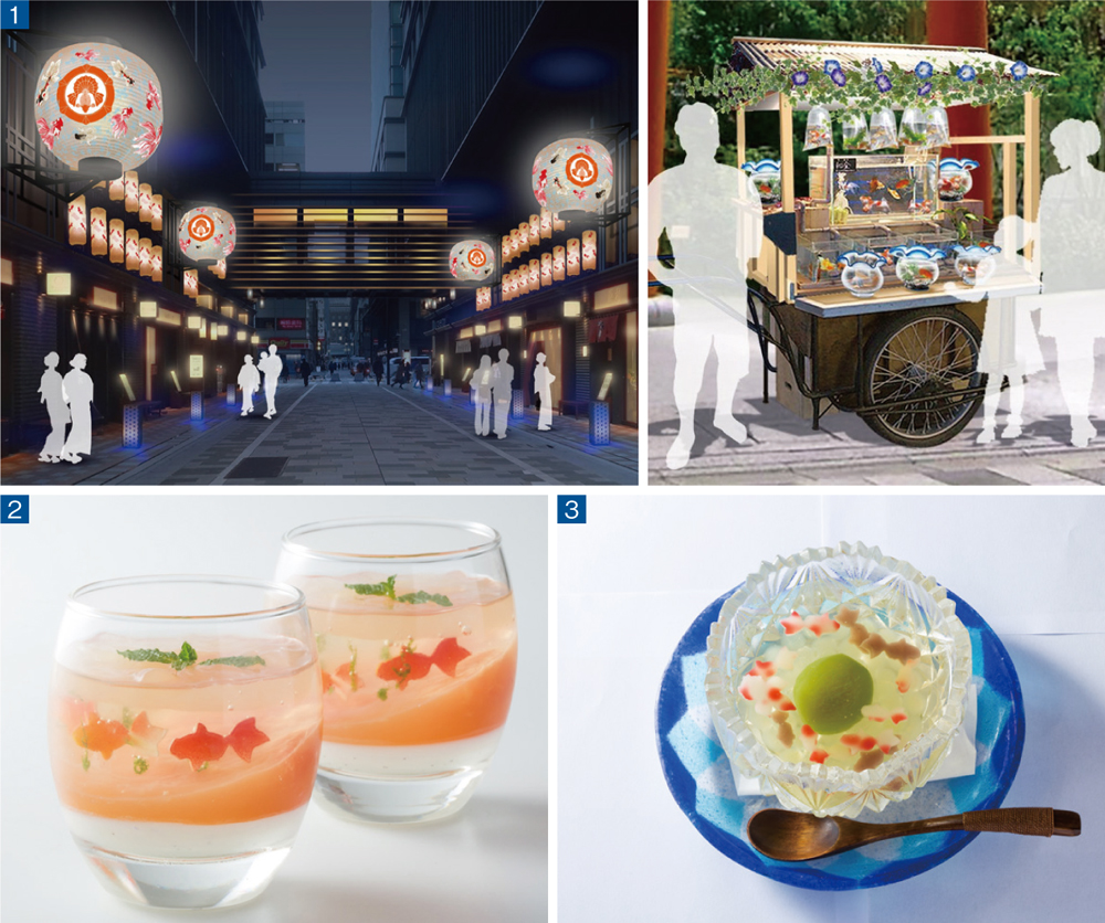 1. 初登場する金魚大提灯が仲通りやコレド日本橋を彩る 2.3.参加店舗の金魚をモチーフにしたスペシャルスイーツを楽しむ「金魚スイーツさんぽ」を初実施。写真左・期間中7〜8月の土日限定で、金魚を販売する「金魚屋台」を初めて実施