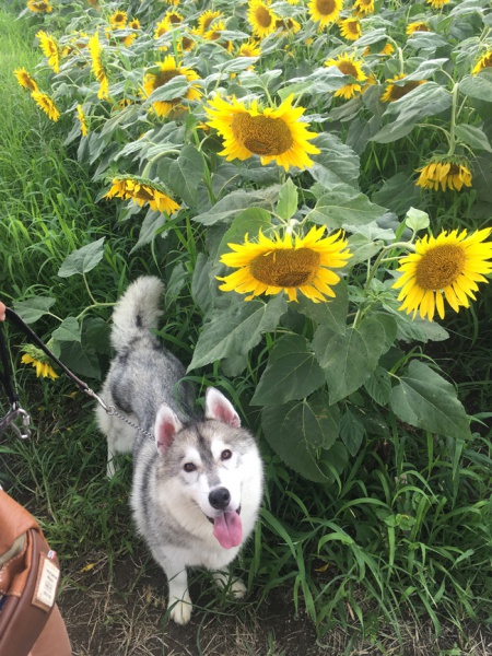 飼い主ちゃーみーさんのコメント「夏のお出かけ。ひまわり畑の中でアニーも笑顔!!」