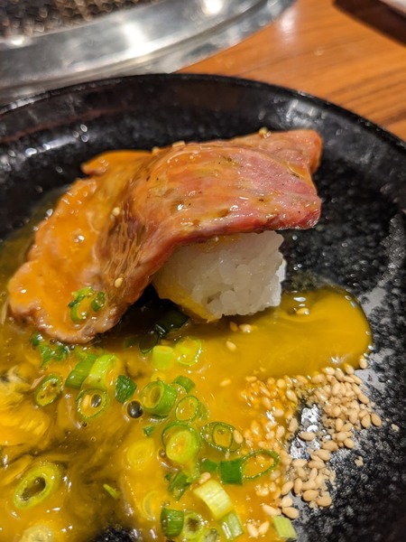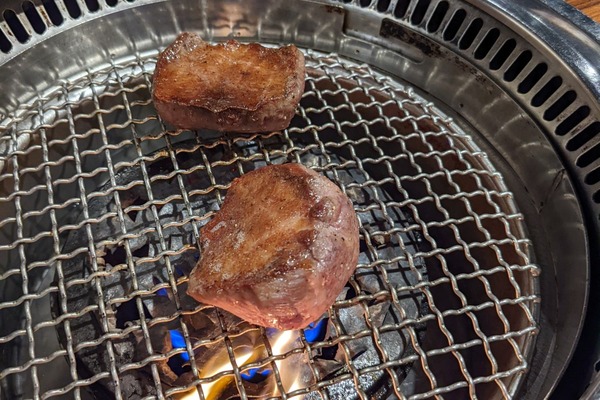 例えば「極牛タンステーキ」。牛タンのなかでも最もやわらかいタン元で、超稀少部位とうたいながらも、他の焼肉店はもちろん、牛タン専門店でもお目にかかれないような厚みとポーションで、焼く前からそのビジュアルに心を持っていかれる。見たこともないタン元をおいしく焼けるのかという一抹の不安はあるが、スタッフがケアしてくれるので心配はいらない。少し焼いたところで裏返し、いい頃あいで再びテーブルに戻ってきて、おいしさのピークで切り分けてくれる。弾力のある食感、噛むほどに広がる肉の旨味。口中に幸せが広がる。