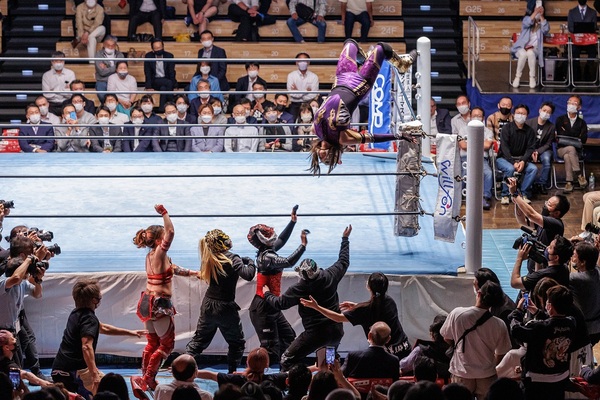 タイガー・クイーンの場外へのラ・ケブラーダ(撮影・堀田真央人)