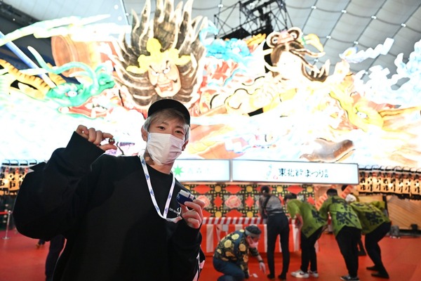 会場には実際の青森ねぶた祭で使われているねぶたを持ち込んでいます。ねぶたのなかでも大型ねぶたと呼ばれるもので、分解して、何台ものトラックに載せられて運ばれてきたそうです。大型ねぶたの重さは約4トンとのことですが、このねぶたは複雑な作りなこともあって、もう少し重いんだとか。それを20人ほどで引きまわします。