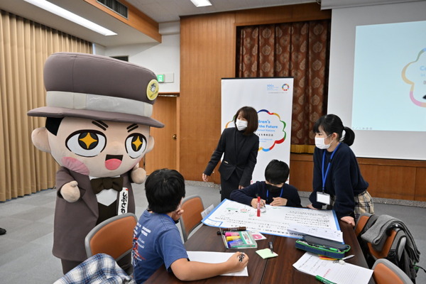 「協調が大事だと思う。北区内の公民館や学校に行って、いろいろな人と話すという“来たく”なるスタンプラリーを小学生で企画します。全部集めると、しぶさわくんのバッジをもらえます」というグループには「バッジなど、けっこうお金がかかると思うがどうしますか」という質問が上がり、「小学生が企画するので、小学生がイラストを描いて、それをプレゼントすることにします」と回答。子どもたち同士で、課題の指摘と改善案をやりとりする姿に審査員も感嘆。