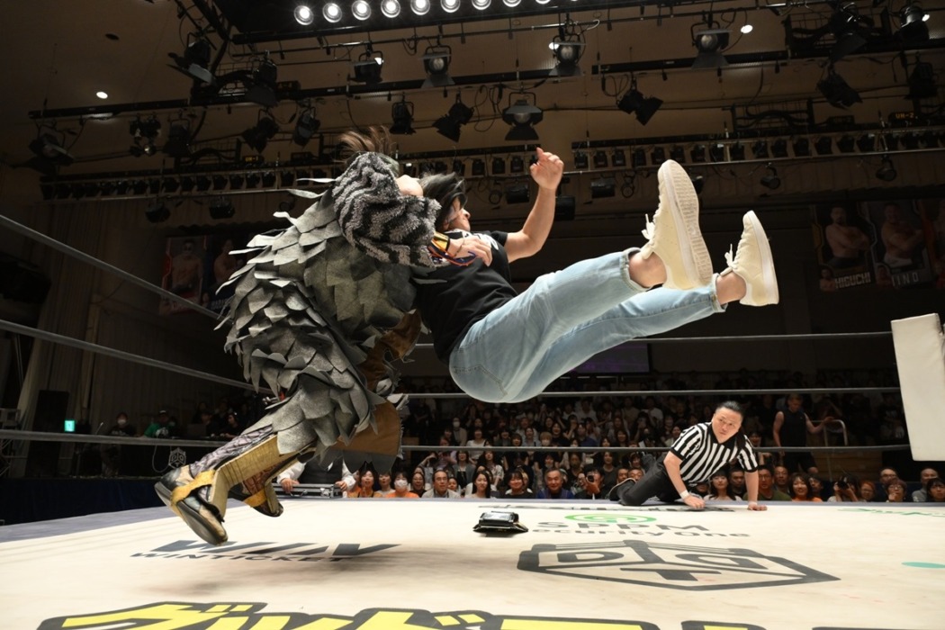 また、第3試合ではSNSで話題沸騰のダンスパフォーマンス集団「O-MENZ」の隈取が出場し、HARASHIMAと組んで、ダムネーションT.AのMJポー&イルシオンと対戦。隈取は得意の空中殺法でイルシオンを追い込んでいくが、レフェリーのブラインドを突いたイルシオンが急所蹴りから首固めで丸め込んで勝利。怒りの隈取はリベンジ戦を要求し、7・16新宿FACEでのシングル戦が決定した。