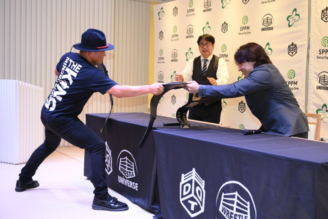 上野が「この記者追い出してください」と言うと、上野がUNIVERSALのベルトを、鈴木がKO-D無差別級のベルトを取って、奪い合いに発展。鈴木が「11月3日、てめえはこれを俺に差し出すことになるんだ!」と言うと、収拾がつかない事態に。今林GMが「記者会見ですから、お帰りいただいてよろしいですか?」とうながして、鈴木は退場した。
