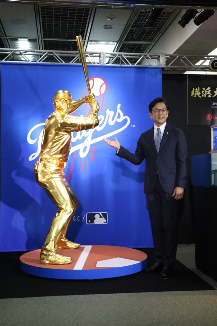 MLBのロサンゼルス・ドジャースに所属する大谷翔平がバッターとして構えているところを黄金像にした「黄金のバッター 大谷翔平」の像が10月1日にお披露目された。