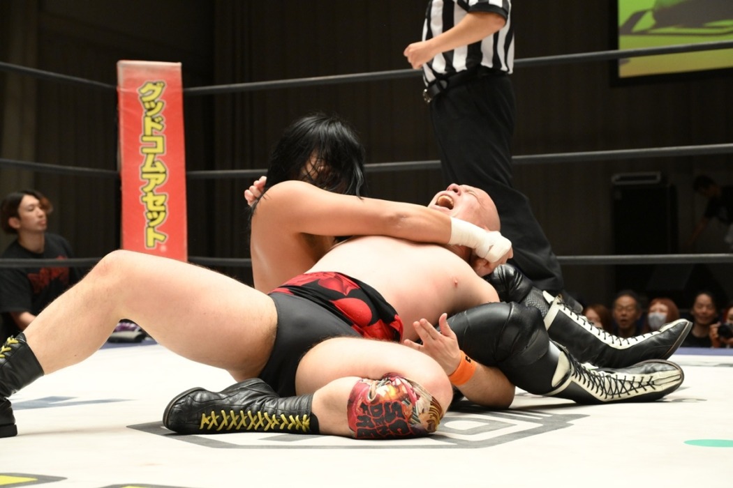 セミファイナルの後には「VANISHING」がライブを行い、同バンドの演奏で入場曲「helvetti」に乗って佐々木が登場。その隣に立ったデスペラードとは2023年7月23日の両国国技館で一騎打ちを行い意気投合。あれから、2年余の月日を経て、相思相愛タッグを組むことになった。対峙するのは元ダムネーションメンバーの石川修司と、佐々木のプロレス人生では欠かせない男・アントーニオ本多の2人。佐々木は8・30ひがしんアリーナ(墨田区総合体育館)大会で脇腹を骨折して欠場したため、記念試合が1カ月ぶりの復帰戦となった。