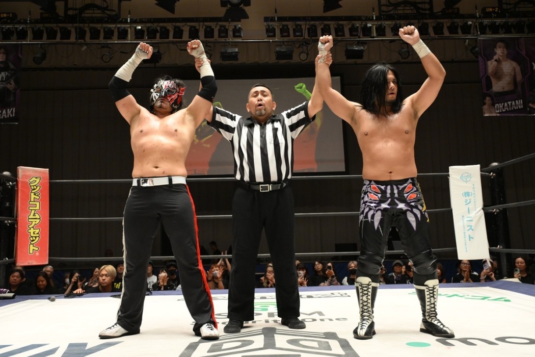 勝ち名乗りを受ける佐々木(右)とデスペラード