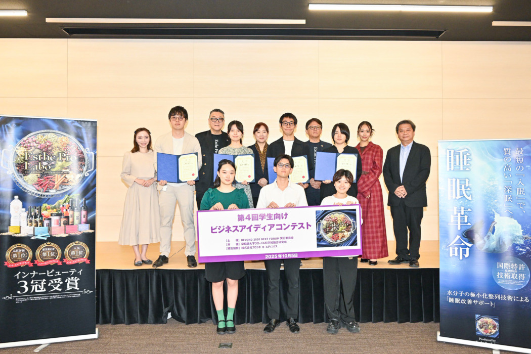 準グランプリは早稲田大学大学院先進理工学研究科5年一貫制博士課程3年の深澤亮さんのスマート美容アイマスクをコアアイテムとした「ポータブル睡眠美容キット」。エステプロ・ラボ賞に早稲田大学先進理工学研究科5年一貫制博士課程5年の三野流斗さんの睡眠福利厚生プログラム「Sleep Wellness 360°」、北海道大学獣医学院博士課程2年の宮本汐里さんの睡眠改善アプリ「クロノシル」。今回はスピンオフ企画としてXでもビジネスアイデアを募集し、株式会社マーガレットコネクションの水紀華氏が審査を行い最優秀賞と準優秀賞を発表した。
