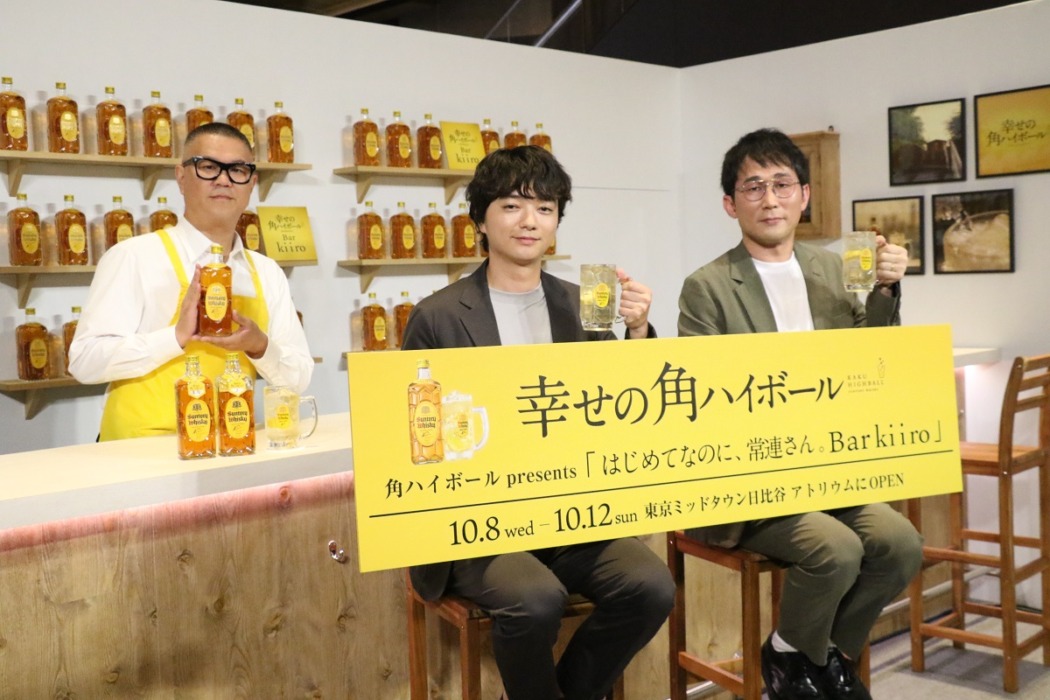 「Bar kiiro(きいろ)」は「角瓶」のCMの舞台となっているバーの名で、今回はそれをイメージした造りの期間限定ポップアップバーを東京ミッドタウン日比谷のアトリウムに設置。この日は長谷川がバーテンダー、じろうは角瓶のCMに出演中の俳優の染谷将太とともに常連客としてトークを展開した。