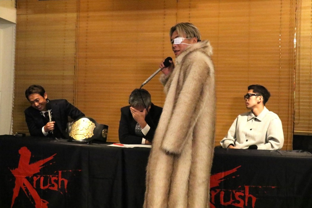 ここで児玉が会見に乱入して「なんで挑戦者は俺じゃないの?」とクレーム。宮田氏が「児玉選手も篠原選手もいい試合をした。でも11月29日ってことを考えると、これからもあるし、ここで無理はさせられない」と児玉のコンディションを考慮しての決断であることを説明したものの、児玉は「次の挑戦者は俺でしょ」とアピール。そして「勝ったほうとやろうぜ」と言い残していったん引き下がった。