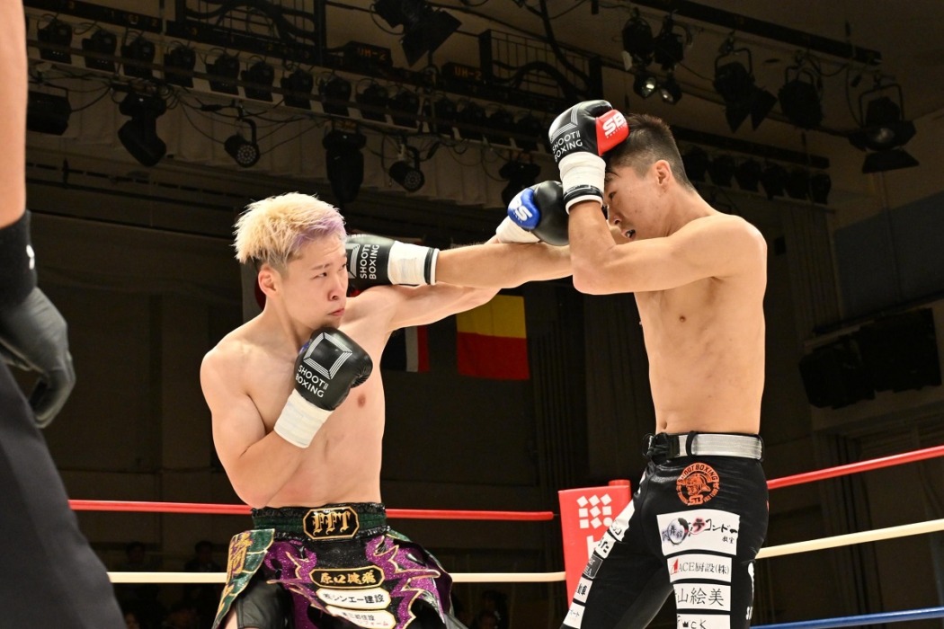 1R、サウスポーの川上とオーソドックスの牧野。ともにインローを蹴り合う。川上はボディーストレート。川上は左ミドル、ワンツー、左インロー。川上のワンツーに左フックを合わせる牧野。川上は左インロー、奥足への左ロー、右ジャブ。左インローがローブローとなり一時中断。再開後、すぐにラウンド終了。オープンスコアはジャッジ2人が10-9で川上。