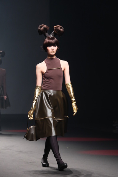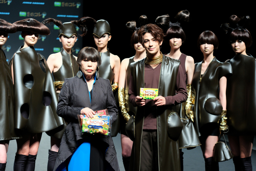 デザイナーのコシノジュンコ氏とコラボレーションしたショーで、「きのこの山」にインスパイアされたコートやドレスなどを身にまとったモデルたちが、頭のきのこを揺らしながらウォーキング、招待客らがため息をもらした。