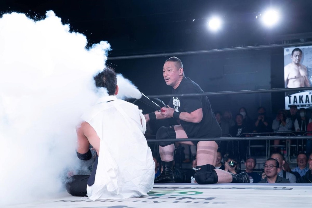 体調不良(狭心症)と経営に専念するため、昨年7・21両国大会をもって無期限休業に入った髙木は医師からGOサインが出たことで、11・3両国で葛西陽向を相手に復帰戦を行う。それに先駆けて、今大会の第1試合で髙木は一般人・澤宗紀とエキシビションマッチ(5分1本勝負)を敢行。いきなり澤と張り合った髙木はドロップキックも繰り出したが、澤のシャイニング・ウィザードでわずか28秒で秒殺された。ここで、この一戦を見たいがために自腹でチケットを購入して観戦していたDDTの今林久弥GMがリングに上がり、「16年ぶりのシングルマッチと言って、チケット売っておいて、このザマか! そういうのは詐欺師と言うんだよ。CyberFight副社長が詐欺師なんですか!」とブチ切れ! 何の権限もないはずなのに、今林GMは再試合を指令。