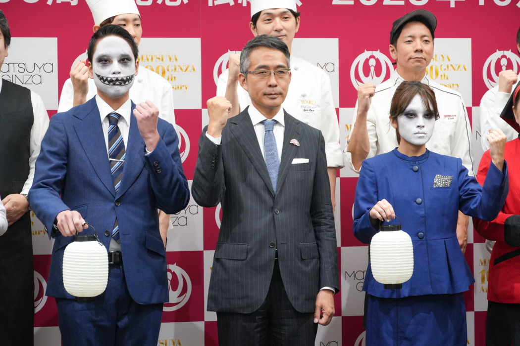 松屋銀座開店100周年記念イベント「松縁祭」に向けてガッツポーズするおばけたち