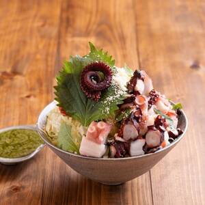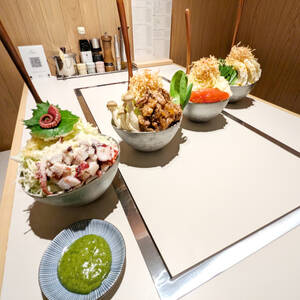 「こぼれや」は、定番から、カレーやイタリアンなどさまざまなアプローチを凝らした創作もんじゃで人気の店。香辛料が食欲をそそるカレーフレーバーのもんじゃ、タコの赤と緑色のソースのコンビネーションが美しい「ジェノベーゼ」など、こだわりの具材がこぼれんばかりに盛られた丼で運ばれてくるビジュアルは国内外から注目を集めている。