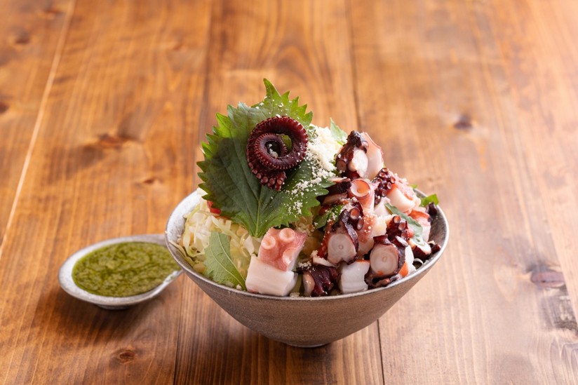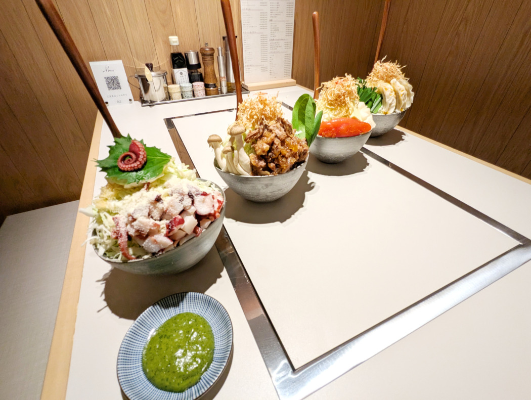 他メニューに、最高級の博多明太子と国産餅を使用した一番人気&定番「明太餅」、鹿児島県産黒豚餃子と濃厚な白湯を合わせた「鳥白湯餃子」、東京の下町の駄菓子屋で子どもたちに愛された豚バラとべビスターを合わせた元祖もんじゃを「こぼれや」風に仕上げた「昔ながら」などを提供。月島という場所柄、海鮮を使ったメニューもふんだんだ。