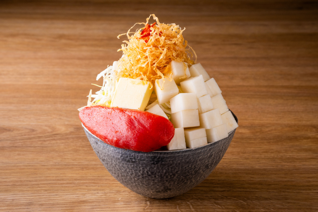 〈唯一無二の下町創作もんじゃ〉を掲げる「こぼれや」は、「もんじゃの美味しさを根本から進化させる」ことをテーマに、厳選された素材をイチから見直し、おいしさのベースでありキーとなる”もんじゃ出汁”を刷新。北海道・美瑛町の「美瑛小麦」、鹿児島県大隅半島「鹿児島黒豚」、山梨県富士吉田市「富士山の現流水」など、十種の国産素材を長時間かけて丁寧に煮出したという。