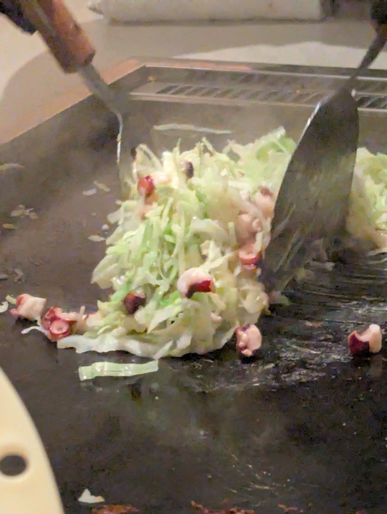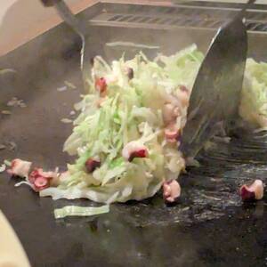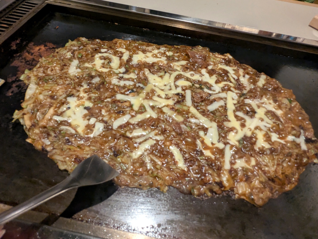 もんじゃは、目の前の鉄板でスタッフが調理してくれるスタイルなので、食べること、もしくは映えを狙うことに集中できる。もちろん、もんじゃ初体験!というビギナーには助かる。丼にどーんと盛られたもんじゃの材料一式を持ってテーブルに到着するなり、調理がスタート。食べられるまでは数分。ただ、金属ベラと鉄板がぶつかる音と、そのたびに薫ってくるカレーの香りで、その時間はすごく長く感じた。