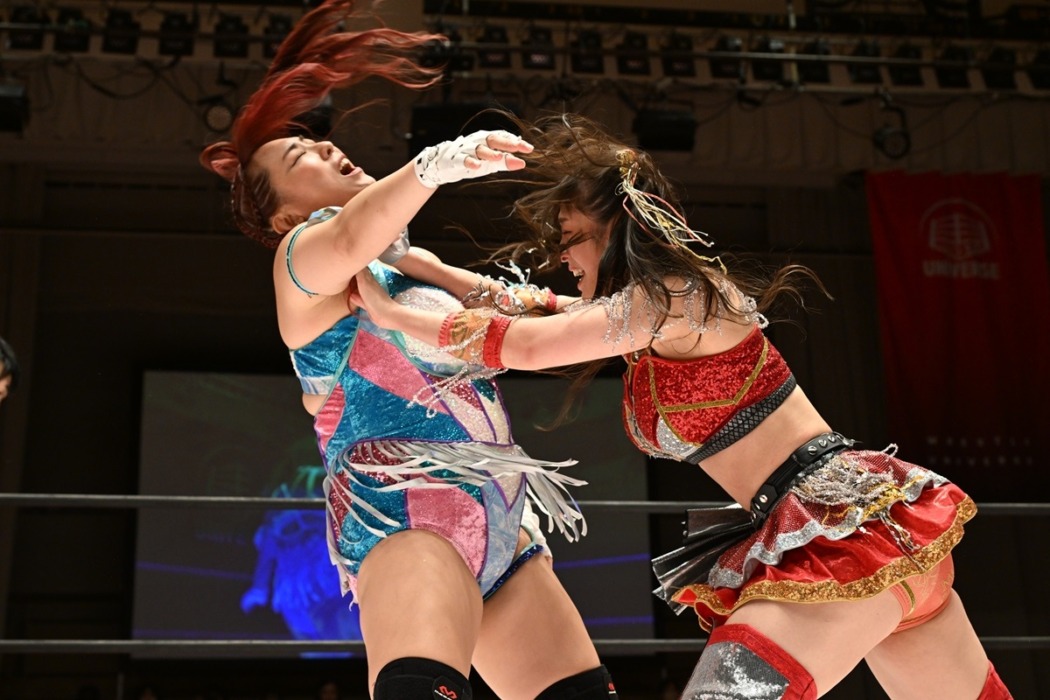 上福にとって、まなせはデビュー戦でのパートナーであり、初のタッグ王座挑戦の際にもコンビを組んだ元タッグパートナー。上原と凍雅は同じ日に練習を始めた同期生で、4選手ともにさまざまな思いを抱いてのタイトル戦となった。