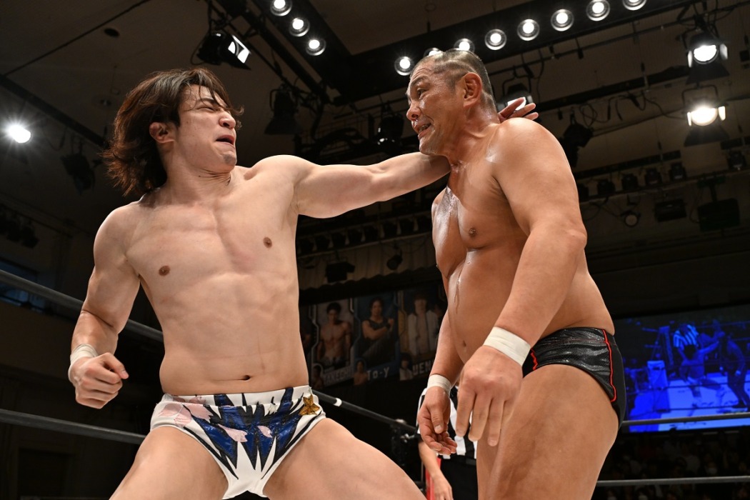 高鹿との攻防の中でロープに走った武知にエプロンの鈴木が蹴りを入れるとにらみ合いに発展。そこからエルボー合戦となるが、打ち勝つのは自力で勝る鈴木。