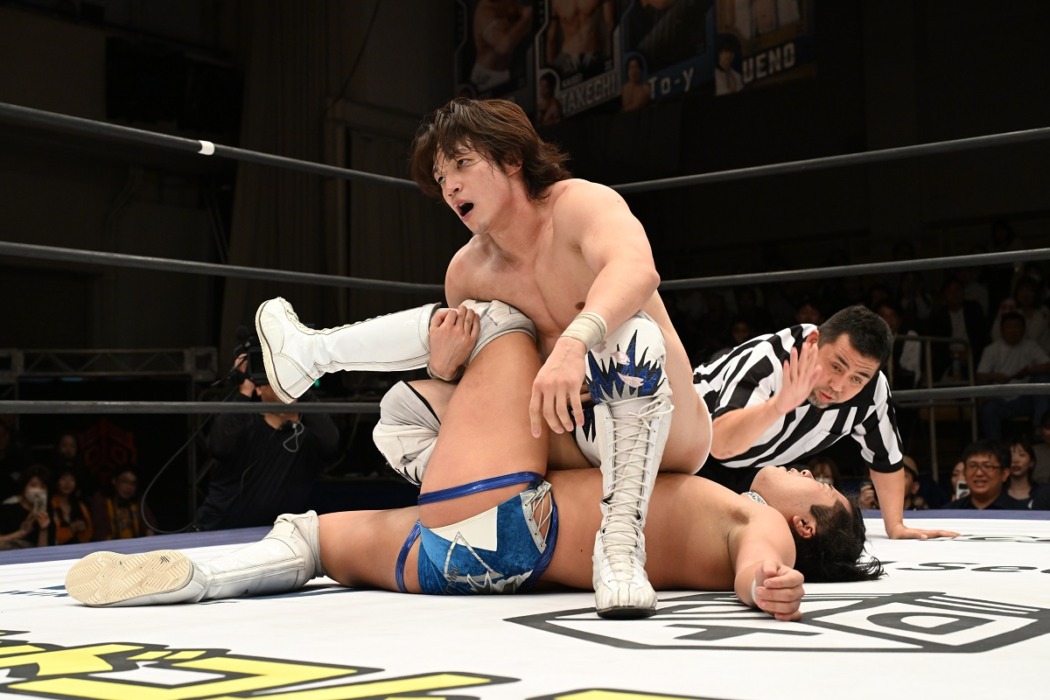 高鹿が上野を追い込む中、鈴木がエプロンで武知を腕十字にとらえるなどピンチの王者組だったが、最後は上野が必殺のWRからフォールの体勢に。何とかカットに入ろうとした鈴木だったが武知がその足にしがみつき許さず上野をフォロー。そのまま3カウントが入り、王者組が初防衛を果たした。