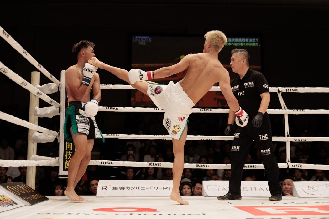 2R、大森は左ジャブ翔は左フック。そしてともにパンチを連打。大森はスイッチを繰り返す。翔は右ボディー、左フック、右アッパーとパンチをまとめる。大森もワンツー、スリーまで。大森はバックスピンキック、左フック。距離置詰めてフック、アッパーのコンビネーション。翔も近距離でパンチを連打。大森は詰めて飛びヒザ、左ミドル。翔のパンチで大森の顔gあはれ始める。大森は左右のミドル。近距離での打ち合いで互いのフックがヒット。圧をかける大森が左右のフック。