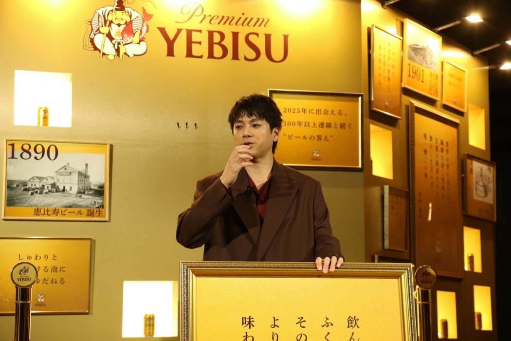 最後は「ヱビスビールのどんだけ歴史があろうが変わり続けようとする姿ってかっこいいなと思っている。常に“新しいものになろう、変わろう”とするのは人間としても絶対大事だと思っていて、それは企業や社会を含め全て。物事は移り変わっていくから、その変化に対応していくというか順応していくことが僕自身、俳優にとっても絶対に大事だと思っていて、そこは心の底からヱビスさんと一緒のマインドだなって思えている。だから僕もこの1秒後、この5秒後、1日後、最高到達点を常に求め続けて変わり続ける、ということをヱビスさんのおかげで思いました」などと同社のマインドと自身の信条を重ね合わせていた。
