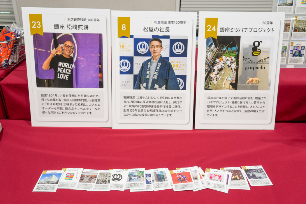 まず、顧客と銀座の街の人々に感謝を込めてオリジナルトレーディングカード「GINZA CELEBRATION CARD」を制作。全30種類のうち14種類は松屋銀座にまつわるカード、16種類は銀座で周年を迎える店舗や襲名など節目を迎える人物などのカードとなる。例えば開店100周年となる松屋銀座の「松屋の社長」カードをはじめ、本店が銀座に移転して160周年となる「銀座 松崎煎餅」カード、創立20周年を迎えるNPO法人「銀座ミツバチプロジェクト」カードなど。