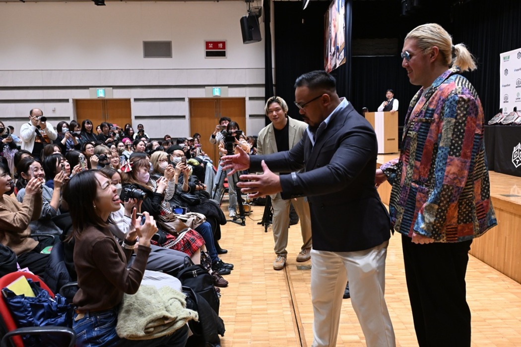挑戦者組のKANONは「4月に結成して、この2人で組みましたけど、まだベルトを持ってないんで、ちゃんと結果を残して、S.L.C.の格をさらに上げたいと思います」とキッパリ。MAOは「S.L.C.やってきて、KANONはいろんなことを経験して。ダムネーションT.Aとか、前にいた団体とかでやってきて、成長してるとは思うんだけど。俺はキャリアのなかで、KO-Dタッグを何回も巻いてきたし、いろんなタイプの人と巻いてきて。今回初めてこういう大きい人と組んで。KO-Dタッグ、コイツらとやるから、100キロに増量して。ヘビー級転向じゃなく、この人たち対策なんで、仕上げてきました。この赤いベルトをKANONと巻いて、またこのベルト獲り戻して、DDT盛り上げようぜ。ドカンバコンの面子で、リングがぶっ壊れるくらいの試合して、後の試合困らせてやろうぜ。俺たちが楽しめりゃいい。すげぇ祭りにしようぜ!」と意気込んだ。