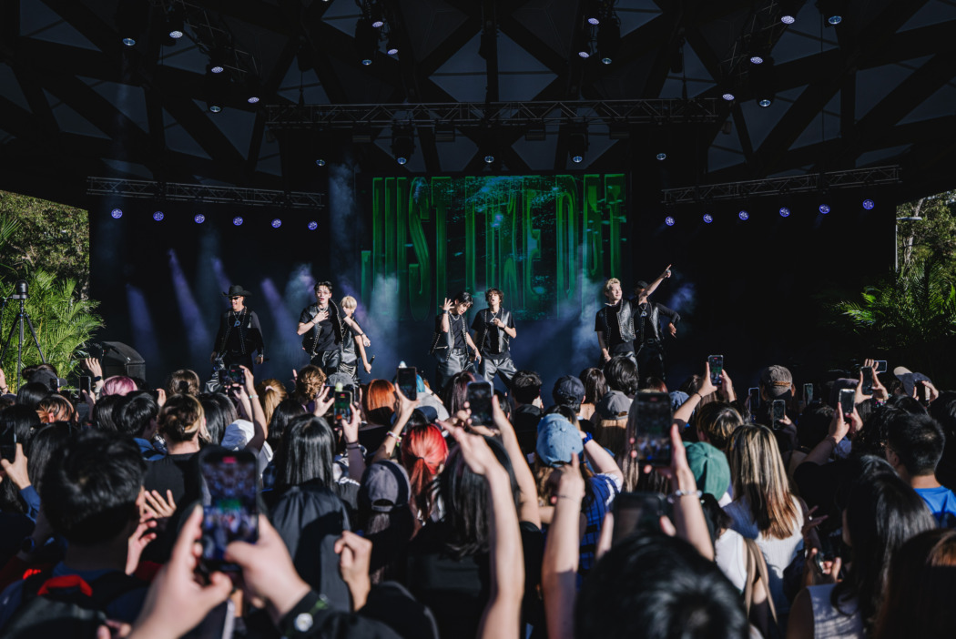 「International Stage」は、SXSW Sydney最大規模の会場である Tumbalong Park の屋外ステージにて開催。音楽ファンや業界関係者のみならず、シドニー市民などすべての人々に開かれたステージで、PSYCHIC FEVERは2番目のアクトとして登場。「What’s up Sydney!」という掛け声とともにステージに現れると、彼らの来豪を待ちわびていたファンの歓声を浴びながら、「Reflection」「RICH & BAD」をパフォーマンス。小波津志の「We’re PSYCHIC FEVER from Japan!!」の挨拶には、会場全体から大きな拍手が湧き起こった。渡邉廉のビートボックスに乗せて小波津が「一秒でも早く気づいて欲しい」と歌い出すと、代表曲「Just Like Dat feat. JP THE WAVY」の始まりに気づいた観客から歓声が。あちこちで観客が踊り出し、会場の熱気は最高潮に達した。