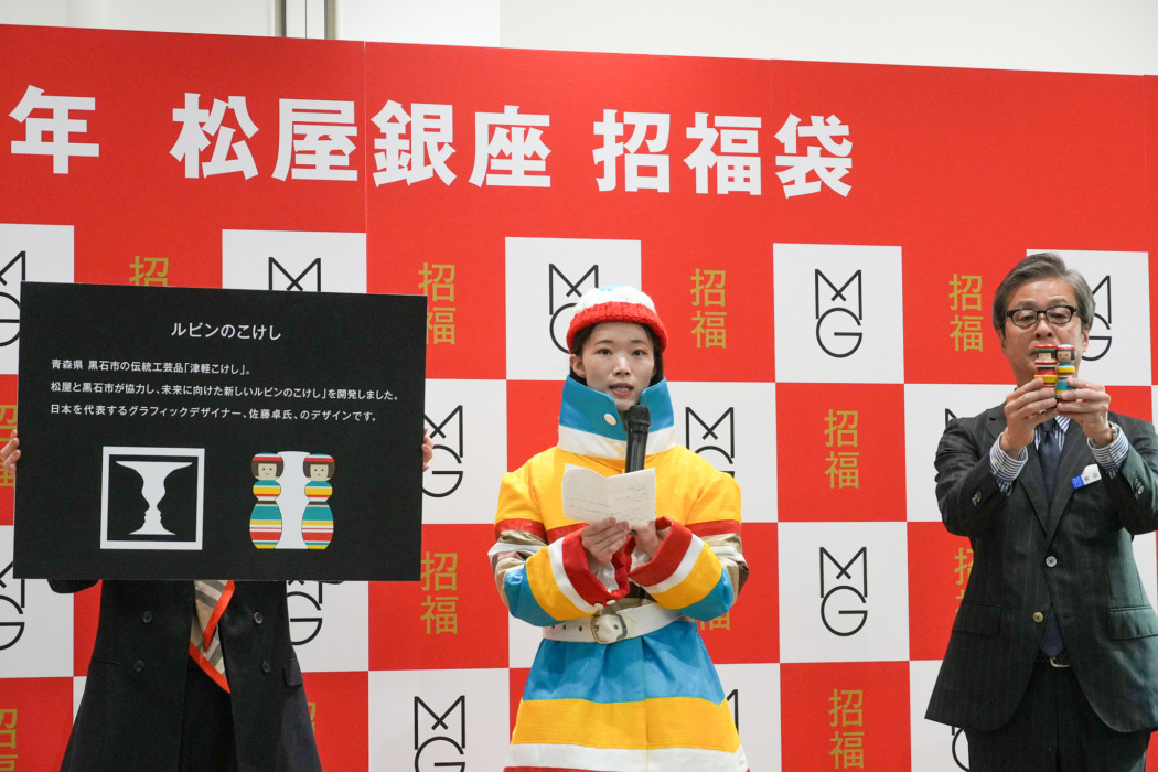発表会では「ルビンのこけし」をテーマに青森県立黒石高等学校が制作した衣装を披露。さらに、青森県黒石市の髙樋憲市長が「ルビンのこけしは松屋さんの地域を元気にしたい、地域の伝統を復活させたいという強い思いで出来上がった。伝統こけしが人とのつながりを表すという佐藤卓さんのアイデアで、このこけしによって企業との連携やこけしに対する皆さんの見方、インバウンドの方々の愛着が深まった。ルビンのこけしが福袋に入ることを黒石市民みんなが喜んでいる」などとメッセージを寄せた。税込2万2000円、限定3袋。