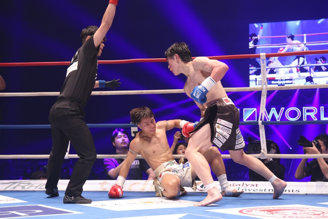 2R、ともにローを飛ばし、黒川はミドル、石井は右インロー。黒川がパンチで前に出るが石井が組み止める。石井の蹴り終わりにパンチを狙う黒川。センターを取る黒川の周りをまわる石井。黒川が左ストレート。そしてパンチの連打。石井は足を使ってかわす。石井のミドルにパンチの黒川。黒川が左ハイからワンツー。そしてロープに詰めてパンチの連打で黒川がダウンを奪う。立ち上がった石井に黒川は右アッパー、左ストレート。石井も前に出て左ジャブで牽制してから左フックでダウンを取り返す。立ち上がった黒川のパンチで石井がバランスを崩すがこれはスリップ。