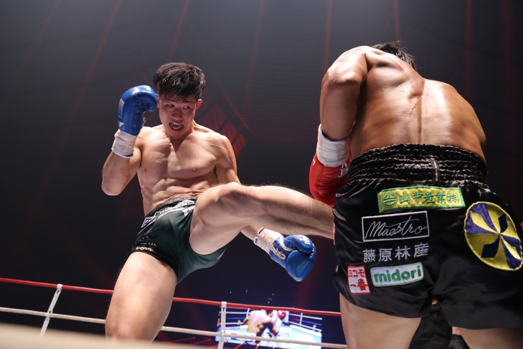 2R、関節蹴りの稲垣。朝久は右フック。互いのパンチが交錯。朝久の左ストレートが炸裂。稲垣は左ボディー。距離が詰まり組み合う展開が増える。近距離で朝久が右ボディー。稲垣も押し返し、ヒザ。朝久が前蹴り、右ストレート、右フック。互いの左フックが交錯。朝久の左フックに稲垣がヒザを合わせる。稲垣の右フックがヒット。朝久は前に出る稲垣に飛びヒザ。稲垣が圧をかけて左アッパー。朝久は左フック。激しい削り合いとなる。