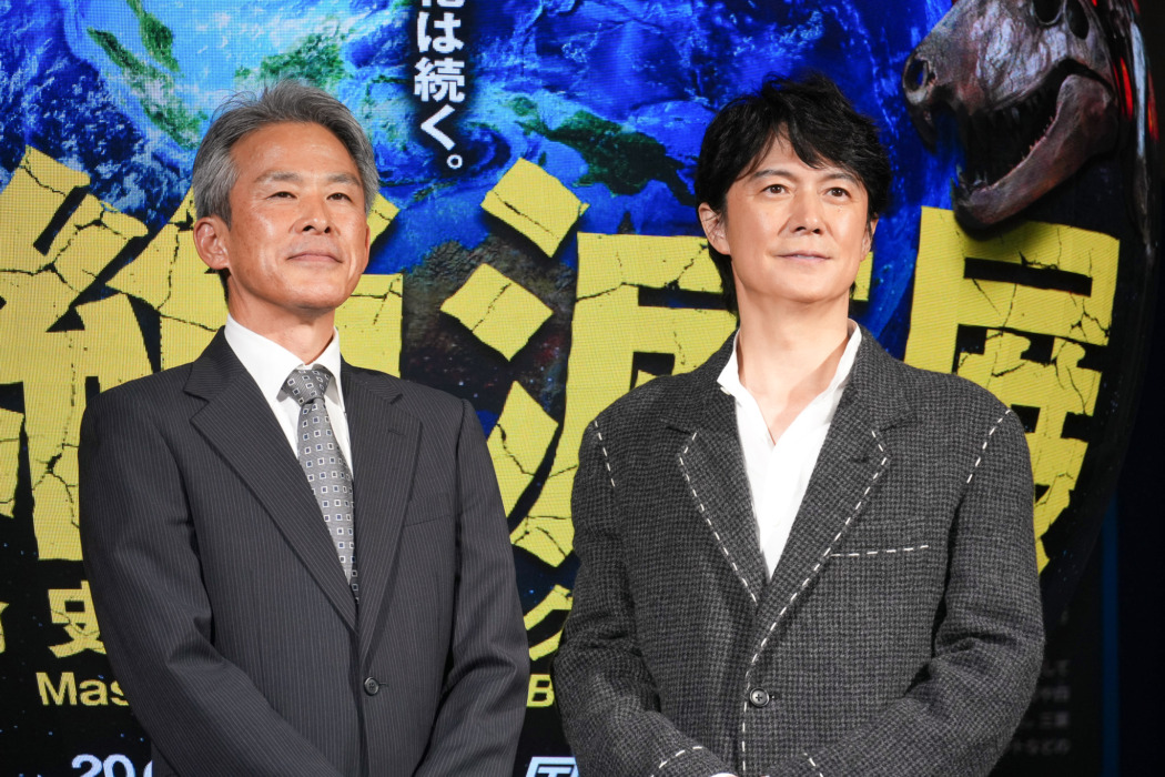 上:特別展「大絶滅展―生命史のビッグファイブ」の映像展示「大絶滅スフィア」/下:総合監修の矢部淳さん(左)とスペシャルナビゲーターの福山雅治