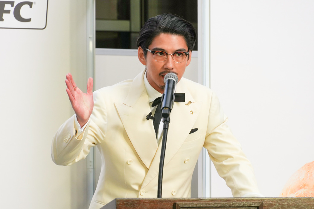 カーネル・サンダースになりきって新商品発表会に登壇した賀来賢人