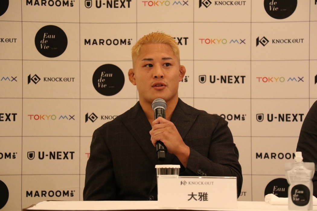会見には大雅のみが出席。「今回、KNOCK OUTに初めて出させていただくんですが、ルールも初めて。でも今回のルールは今一番強い自分を見せられるルールだと思っている。相手も激しい試合をするので、バチバチな会場を盛り上げられる試合ができればと思っています」と意気込みを語った。