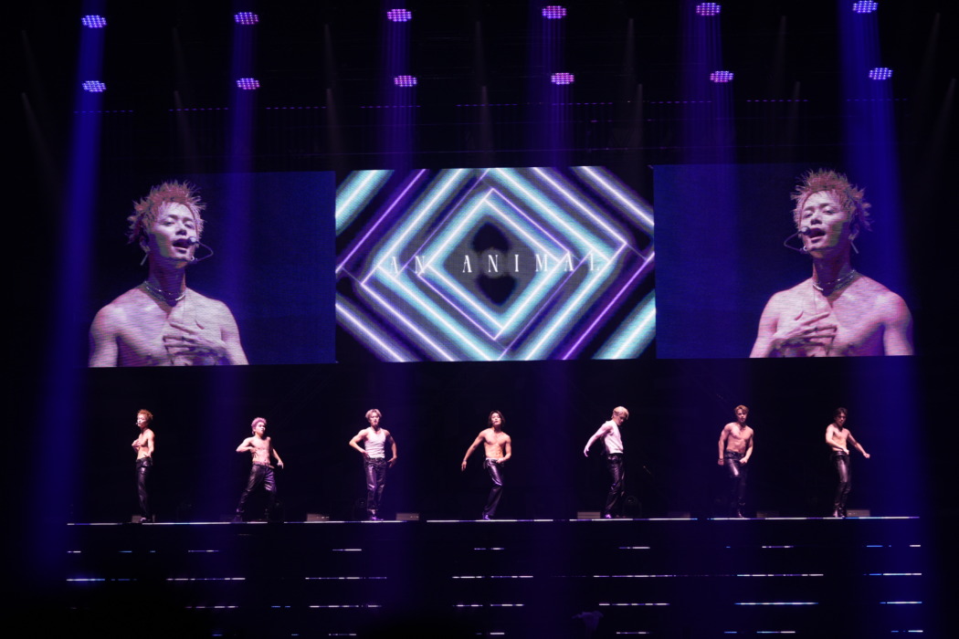 代表曲のひとつでデビュー当時から歌い跳ね続けてきた「テンハネ‐1000%‐」では、これまでのライブでもファンに喜ばれてきたSTOMPを取り入れたパフォーマンスで魅せる。会場の空気をがらりと変えた松井の演出によるセクシーな着替えシーンから始まった「All of You」から代表曲のセクシーなナンバー「Animal」のパートはメンバーが鍛え上げたボディで観客にため息をつかせる場面も。リリースしたばかりの冬バラード「Winter Glow」では7人の歌声とハーモニーに会場が聴き入り、奥田のラップがリードする形で始まった「7」でがらりと雰囲気をかえて、ライブの後半戦へと突入した。
