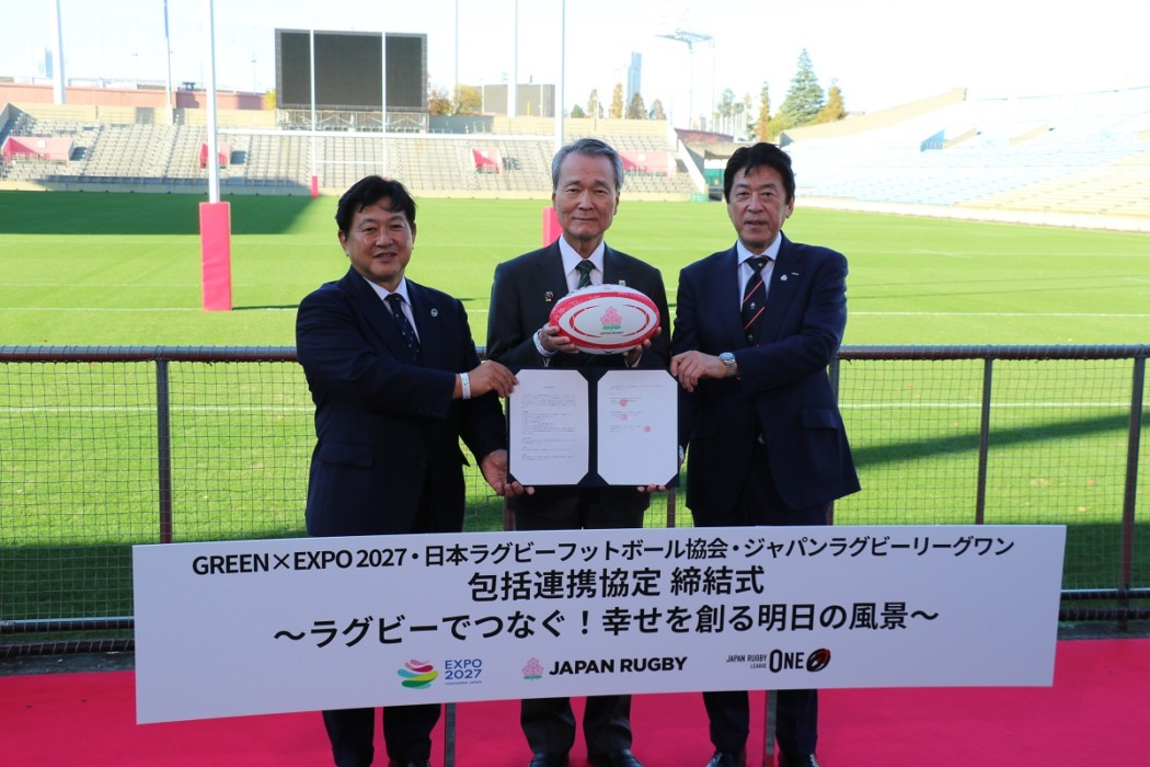 日本ラグビーフットボール協会とジャパンラグビーリーグワン、そして2027年国際園芸博覧会協会(GREEN×EXPO 2027)が11月28日、持続可能な社会環境づくりを目指す包括連携協定を結んだ。今後はSNSを通じたキャンペーン、ラグビーの試合会場等での情報発信、桜の木の植樹式といった活動を3者が連携して行っていく。