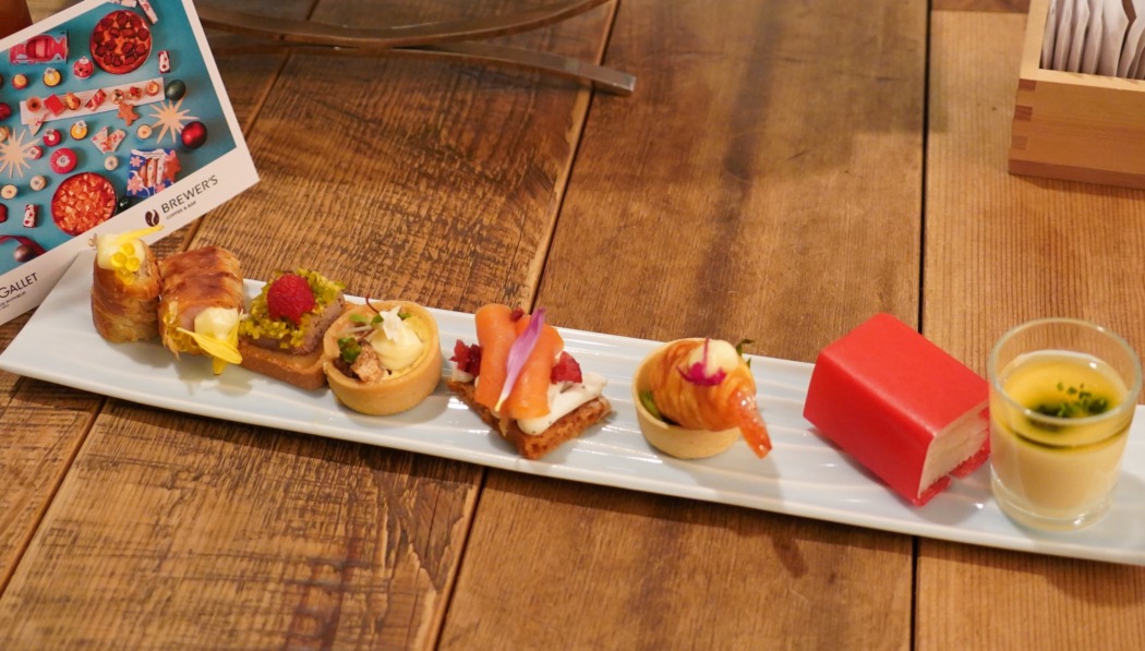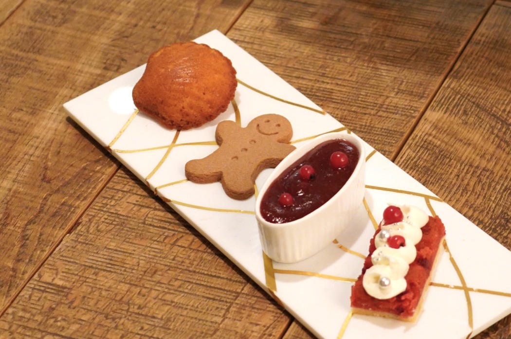 セイボリーは、「カリフラワーのフランとコンソメジュレ キャビア添え」や「パテ・ド・カンパーニュとピスタチオクランブル ラズベリー添え」「ポテトを纏った小エビのフリット」など、7種類を1プレートに並べてテーブルへお届け。アルコールに合わせたくなる華やかで豪華なアミューズ7種。フェスティブシーズンにふさわしいラインアップ。