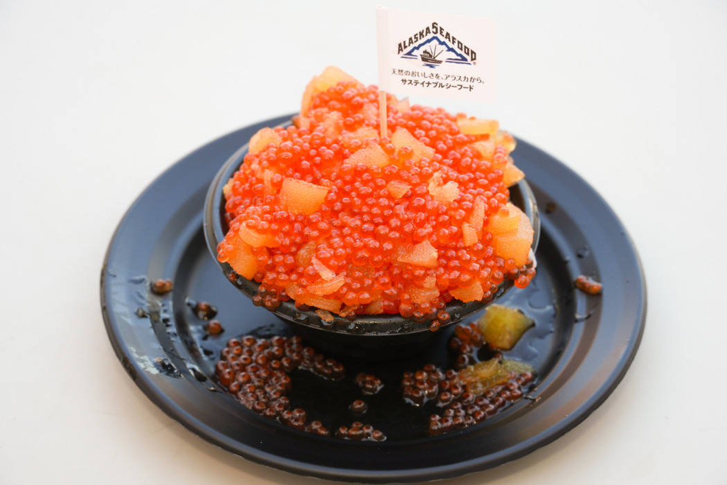 「アラスカシーフードマーケティング協会&極洋」ブースの「アラスカ産紅鮭いくらと数の子のこぼれ宝石丼」は、サステナブルな漁業で漁獲されたアラスカ産天然紅鮭のイクラと、アラスカ産ニシンの数の子をご飯の上からこれでもかとトッピング。粒ぞろいのイクラのプチプチ食感とコクに、コリコリした歯触りの数の子が合わさり、得も言われぬ幸福な味わいが口いっぱいに広がる。