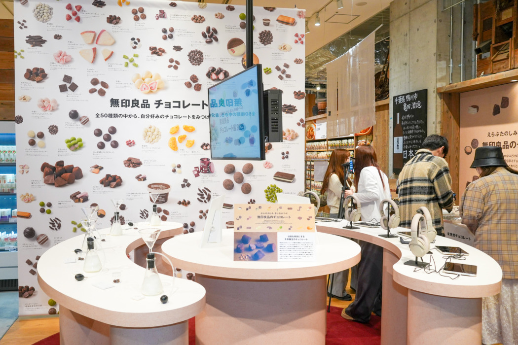 ショッピングモール「有明ガーデン」内にある「無印良品 東京有明」は同ブランド国内最大級の店舗。「無印良品 チョコレート展」は、今年1月に表参道で開催されて好評だった体験型ポップアップイベントが、装いも新たに店舗で楽しめるチョコレート専門の体験型イベントだ。