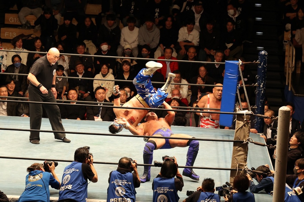 永田と藤田がエルボー合戦。間下に代わると間下は蹴り、パンチで藤田を追い込むが、藤田は間下を自軍に押し込むとカシンがタランチュラ式ヘッドシザース。カシンはリングインすると間下に急所蹴り。藤田に代わるとボディースラムから逆片エビ固め。永田がミドルキックでカットもなかなか外さない藤田。3発目でやっとカットに成功。