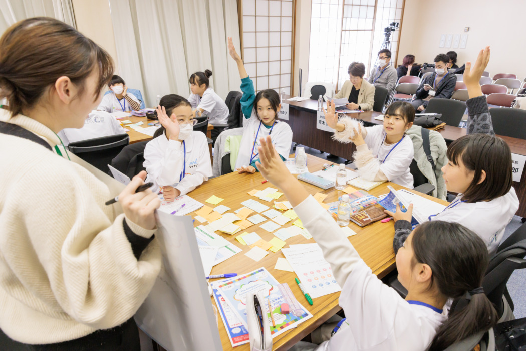 「国連を支える世界こども未来会議」は全国各地で行われているイベント。開催地の小学生たちが自分たちの街にずっと住み続けられるためには何が必要かと考える。ワークショップとプレゼンテーションからなる半日のイベントで、普段は別々の学校に通う同じ年代の子どもたちがチームを作って問題点を考え、大学生らのサポートを受けながら、その解決法を考える。