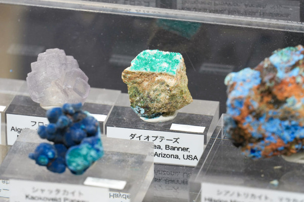 コケのような結晶のダイオプテーズは、銅と酸素が混じり合って美しい青緑色が生まれるそうで、「銅が含まれる鉱物はすごく人気。この緑色に心が掴まれるんですよね」と笑顔で語ってくれた。