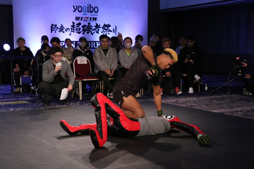 またこのダミー人形が、RIZINのイベントなどでネタを披露したこともある「アマレス兄弟」のネタに登場する人形のようにも見えると指摘されると「え? 登場してた? こいつはティミーっていう名前なんですけど、こいつはこいつでAKAでずっと一緒に練習してた奴なんで。アマレス兄弟さんがパクっているのかもしれない。分かんないけど。日本のことはアメリカに行っていたので全然分からないので。そんな感じですね」と煙に巻いた。