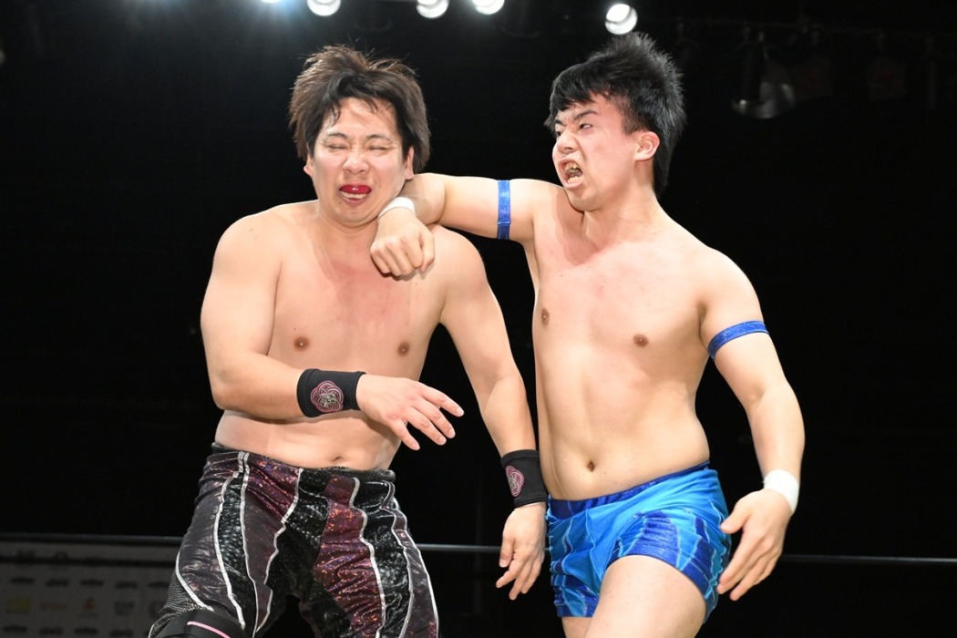 現在、SOG世界無差別級王座は望月成晃(ドラゴンゲート)、SOG世界タッグ王座は中津良太&塚本拓海(BASARA)が保持しており、両王座ともに他団体に流出した状態。石井と今成&冨永はなんとしても年内最後の大会でガンプロにベルトを獲り戻して、年を越したいところ。そんななか、前大会(11・29高島平)で若手軍は「俺たちが勝ったら挑戦権をよこせ」とばかりに、待ったをかけていた。
