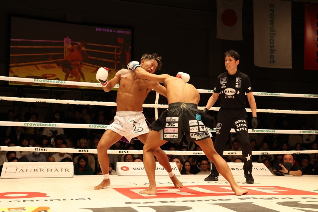 1R、ともにオーソドックスの構え。圧をかける鈴木に花岡が左ジャブ。それでも圧をかけてコーナーに詰めて左右のフックの鈴木。花岡は左ハイを返す。鈴木は飛び込んで左フック。追うが花岡は足を使ってかわす。鈴木の右ハイをかわした花岡が前蹴りからワンツー。圧をかけてパンチの鈴木に右ハイの花岡。これは鈴木がガード。そして前に出て右ローからワンツーの鈴木。花岡は距離を取って前蹴り。鈴木は右ストレート。花岡はっ左フック。圧をかける鈴木だが花岡は足を使ってかわす。鈴木が右ストレートから前に出るが花岡は左ミドル。花岡はスイッチを繰り返す。鈴木がワンツー、花岡もワンツーを返す。